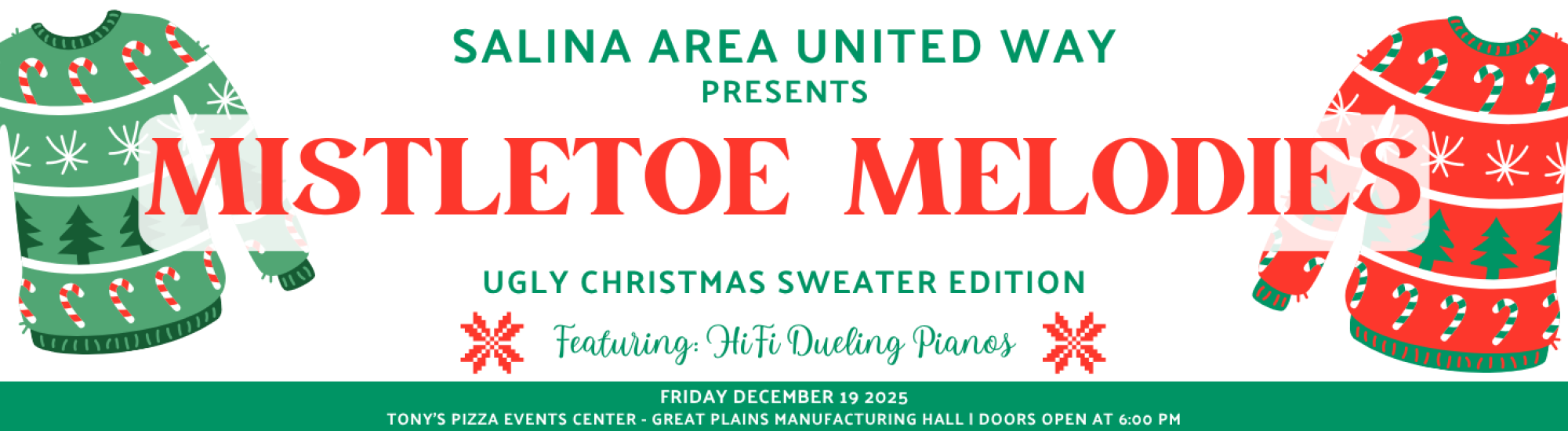 Salina, KS — The Salina Area United Way is thrilled to announce its 5th Annual Mistletoe Melodies fundraiser, happening Friday, December 19, 2025, at Tony’s Pizza Events Center – Great Plains Manufacturing Hall. This year’s event comes with a festive twist—themed as an Ugly Christmas Sweater Edition—and features the always popular HiFi Dueling Pianos.